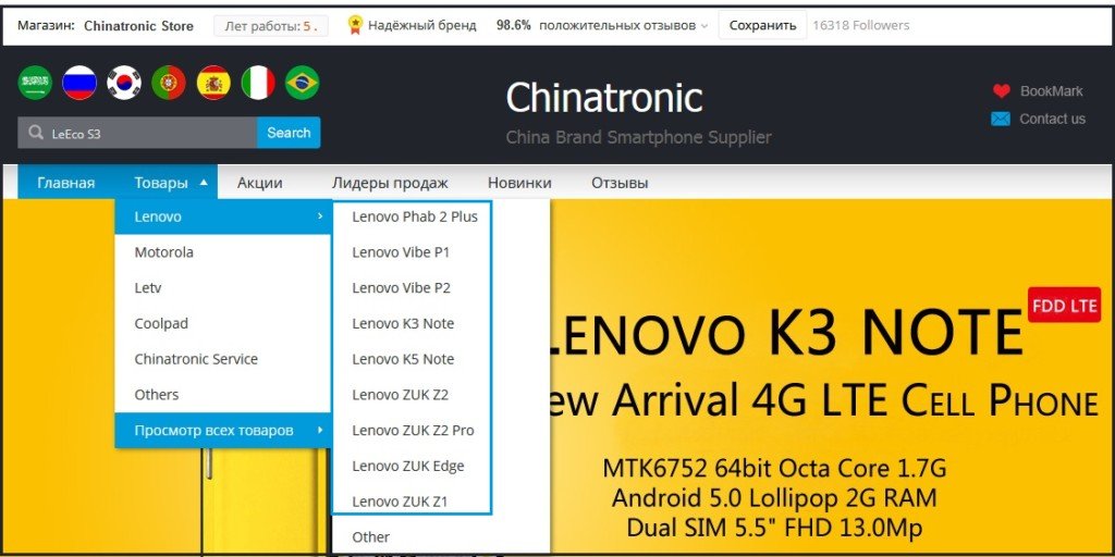 Еще один магазин, специализирующийся на продаже техники Леново, называется Chinatronic Store. На данной площадке можно также приобрести смартфоны Motorola (производства той же Леново) и LeEco (LeTV.) Этот продавец работает на Алиэкспресс еще дольше — 5 лет. Отзывы о нем также, в большинстве своем, положительные. Процент положительных отзывов — 98,6. Среди откликов можно прочитать, что продавец и упаковывает товар хорошо (так, что «переживет ядерную войну»), и общительный, и посылки до российских городов доходят быстро (за 2-3 недели).