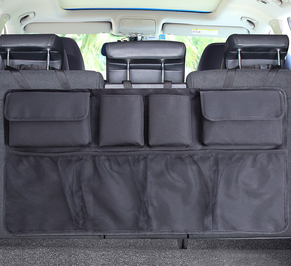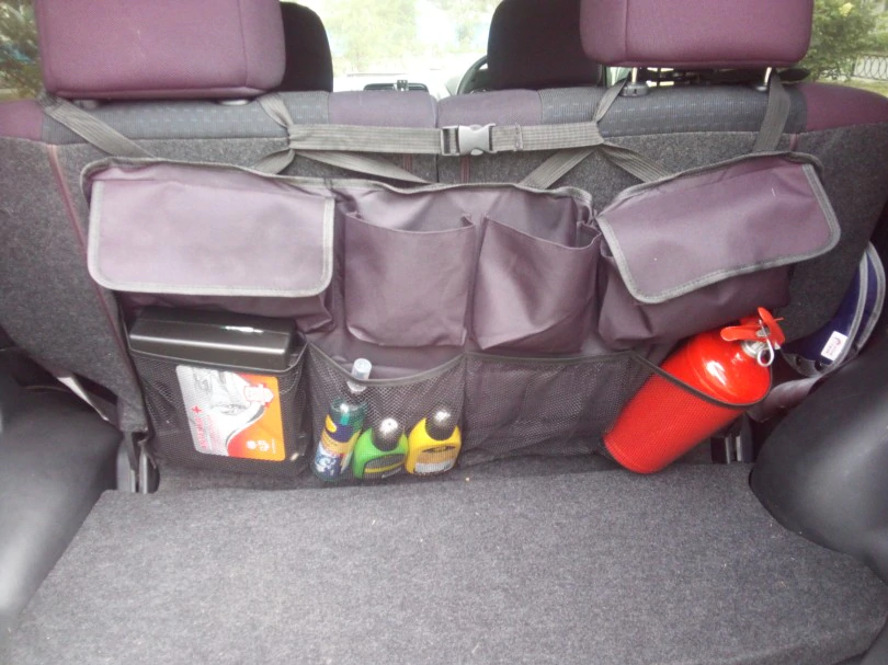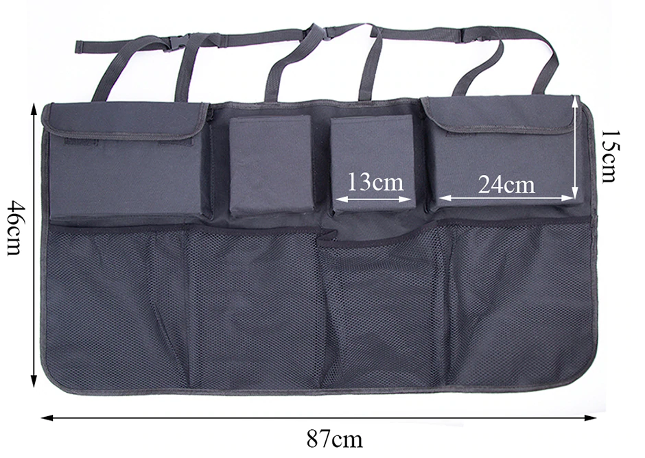 Органайзер изготовлен из высококачественной ткани, легко моется. Закрепляется органайзер за задние сидения автомобиля. Габаритные размеры составляют 870*460 мм. Для удобства хранения различных вещей, предусмотрено 4 зарывающихся отделения с разным объемом. Нижняя часть выполнена из прочной сетки.