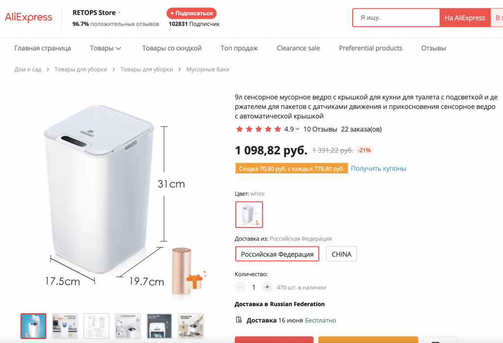 Из отзывов: «Всегда хотел этот удобный ящик. Пластик хороший, дизайн очень красивый. Работает от двух батареек. Когда подносишь руку, лампочка начинает гореть и крышка открывается. Оставляешь на секунд 5, и она сама закрывается.