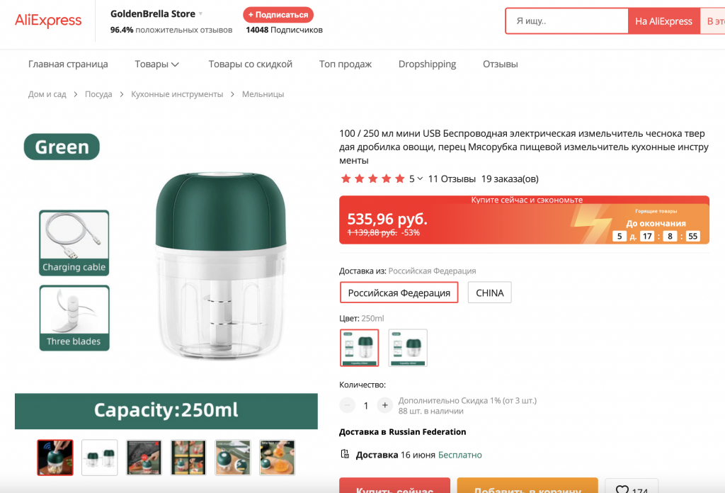 Из отзывов: «Пришла не заряженная, не для твердых продуктов. Крышка не фиксируется, надо держать рукой».