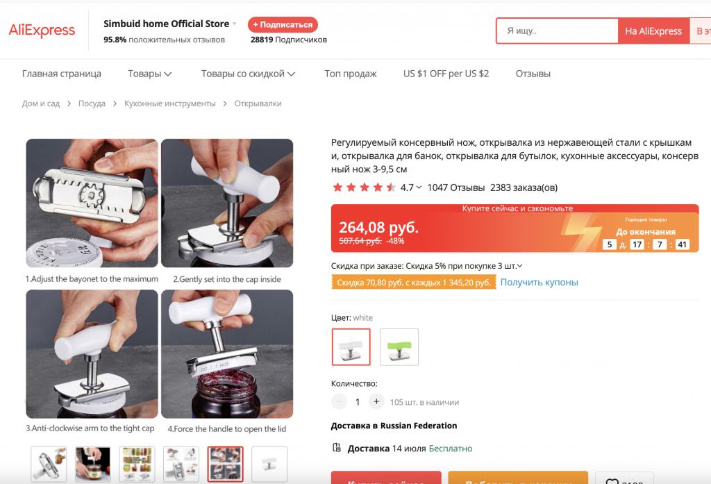 Открывашка для консервов из нержавеющей стали. Ее особенность в том, что ее можно подстроить под разные типы крышек.