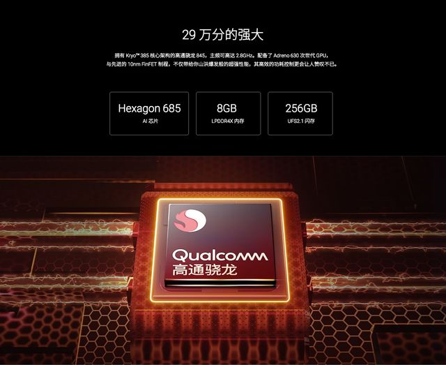 - Чипсет: Qualcomm Snapdragon 845 (4 х 2,8 ГГц + 4 х 1,7 ГГц), Adreno 630 710 МГц GPU