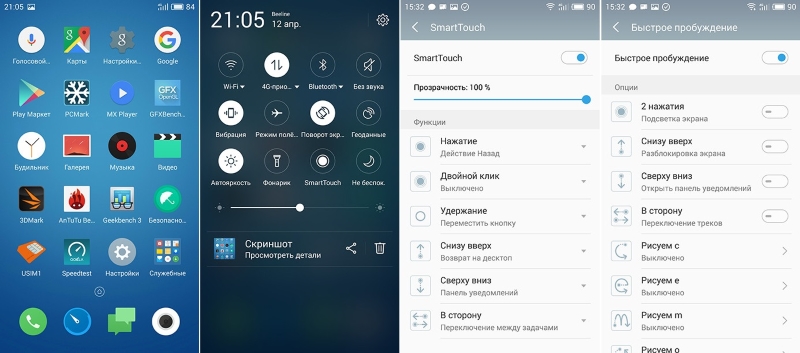 Запущенные программы можно увидеть, если провести пальцем по дисплею снизу-вверх. Тут же нет дополнительных наэкранных кнопок, как в обычном Андроид, поэтому придется привыкать к некоторым особенностям устройства. Зато, Meizu M3 Note можно «разбудить» двойным постукиванием по экрану, либо быстро запускать приложения, рисуя буквы на заблокированном дисплее.