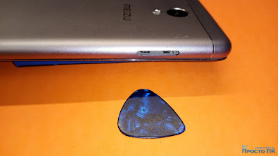 Дальше нужно снять заднюю крышку. Для этого я воспользовался тонким медиатором. Задняя крышка металлическая с пластиковыми вставками сверху и снизу (под ними прячутся антенны). В моём устройстве удобнее всего оказалось завести медиатор в щель возле лотка для карт, на границе металлической и пластиковой частей крышки.