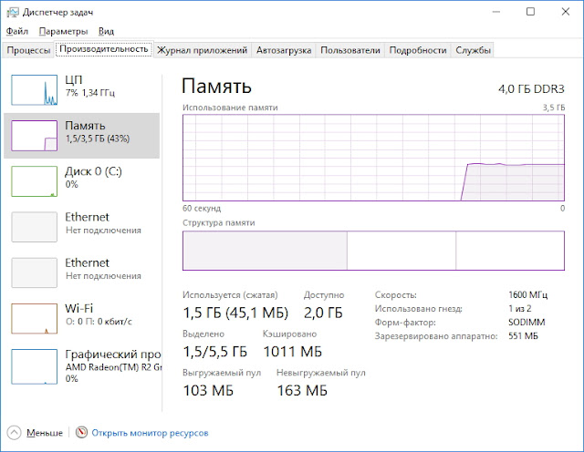 Также небольшое замечание: во всех программах далее не будет отображаться полный заявленный объем памяти, поскольку в моем случае встроенная графика «отъедает» 551 Мб памяти. (см. далее диспетчер задач)