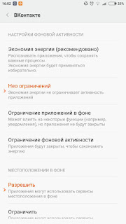 Из списка тапнем на Вконтакте. И по-царски поставим ему «Нео ограничений» (Это значит нет ограничений фоновой активности, просто наши ребята видимо были на 8-ой кружке кофе, пока переводили глобальную прошивку. Ну да неважно, всё равно молодцы.)