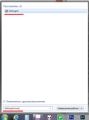 Нам нужно клацнуть на кнопку Пуск и в строке ввести такую команду – diskmgmt.msc. Клацаем на появившуюся ссылочку.