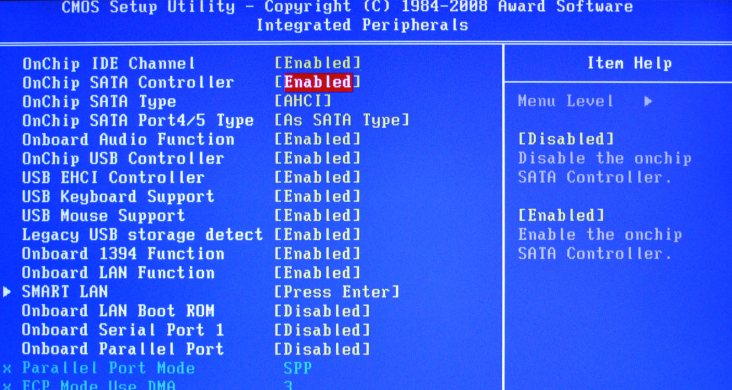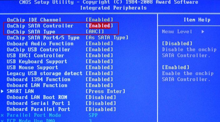 Иногда у пользователей SSD не обнаруживается даже в Bios. Самой первой причиной может быть отключенный контроллер SATA. Найдите этот параметр в Биосе и проверьте, если там стоит Disabled, то нужно изменить на Enabled.