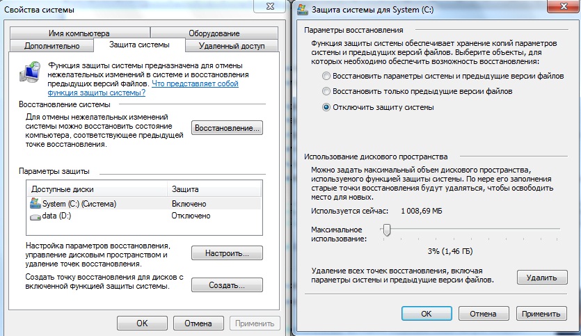 В настройках выбираем “флажок” – “отключить защиту системы”, затем нажимаем кнопку “удалить” и “ОК”