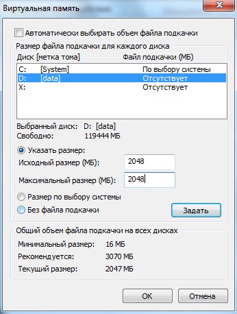 Заходим в меню Пуск, кликаем правой клавишей мыши на папке “Компьютер” и выбираем “свойства”. C свойствах компьютера, в левом меню выбираем “Дополнительные параметры системы” – “Дополнительно”.В строке “Быстродействие” жмем на кнопку “Параметры”. Выбираем раздел “Дополнительно ” и жмем на кнопку ”изменить”. Выставляем значения как на рисунке (размер файла можете изменить, у меня он 2048МБ) и выбираем диск, на котором будет хранить файл (у меня D). Нажмите кнопку задать и файл подкачки переместиться на другой диск.