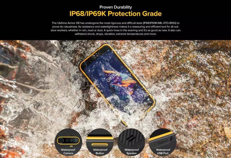 Девайс отлично противостоит ударам, механическим нагрузкам. Производитель заявил, что смартфон на 2 сим карты соответствует в этом плане стандартам защиты IP68, IP69K (водонепроницаемый). Цена Ulefone Armor X8 Land Rover рассчитана на достаточно скромный бюджет. Остальные показатели направлены на покорение рынка мобильных телефонов с мощным аккумулятором.