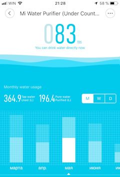 Никакого управления или настроек в приложении нет, только текущие показания и статистика. Зато данные довольно подробные, начиная от точного состояния фильтров, сколько истрачено воды за каждый день, и изменение качества воды на графике.