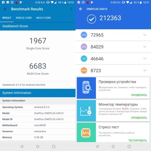 Слева — результаты теста Geekbench. справа — AnTuTu