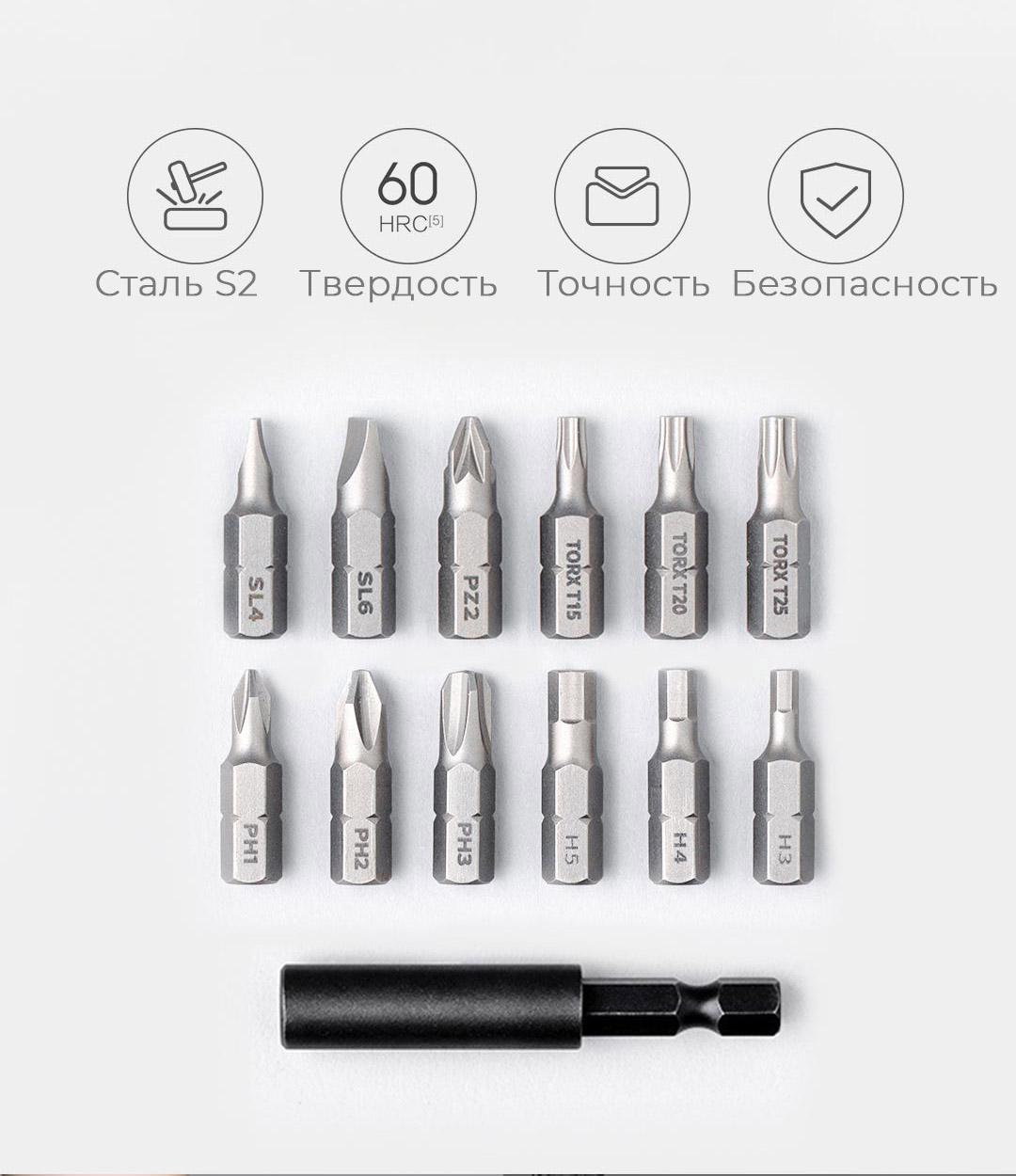 12 комплектных бит к отвертке Mijia выполнены из качественной стали S2 с высочайшей точностью. Они были дополнительно закалены до такой степени, чтобы обеспечивать твердость без растрескивания и упругость без мягкости. С удлинителем на 60 мм отвёртку можно применять в узких и труднодоступных местах для самой разной работы.
