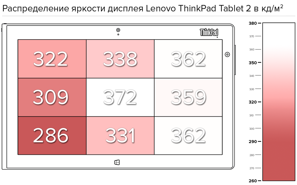 У Lenovo ThinkPad Tablet 2 IPS-дисплей с разрешением 1366×768 пикселей. Насыщенные цвета, широкие углы обзора, картинка хорошего качества. Дисплей распознает до пяти одновременных прикосновений, точность сенсорного экрана на высоком уровне. Максимальная измеренная яркость на среднем уровне — 372 кд/м 2 . При этом дисплей обладает худшим распределением яркости — 77% и лучшей контрастностью — 1165:1.