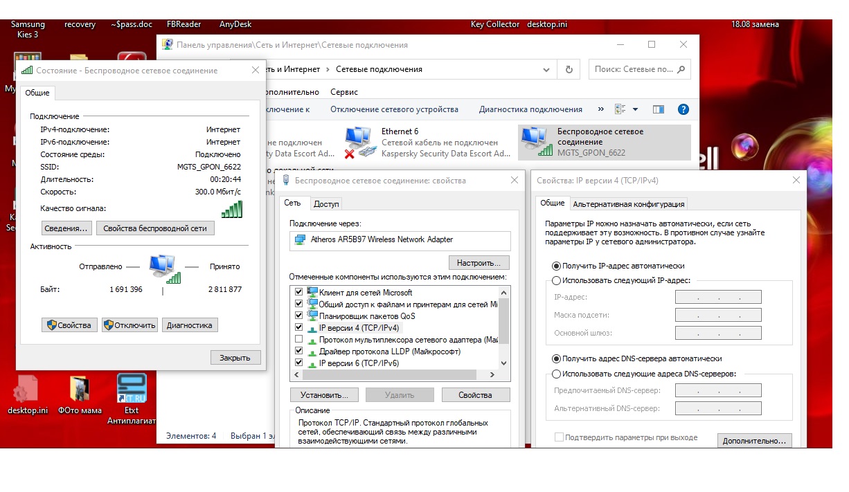 Иногда отсутствие интернета бывает из-за не настроенного адаптера. Как настроить? Нажимаем Беспроводное сетевое соединение, Свойства , IP версии 4 (TCP/IPv4), выбираем Получать IP-адрес и DNS автоматически. Если эта функция не работает, возможно, что проблемы с роутером. Например, не включен или не работает DHCP протокол.