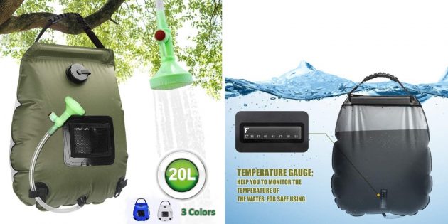 Удобный душ (от 20 литров), его легко прицепить к дереву, набрать воды и наслаждаться прохладной водой в летнюю жару на природе. Термометр, к слову, встроенный. Всегда будете знать, какой водой моетесь (горячей или холодной).