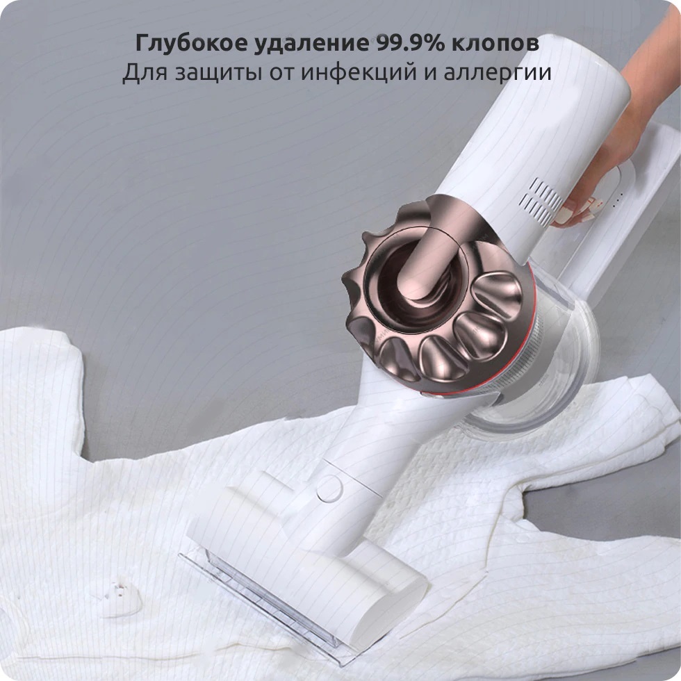 У насадки для удаления клопов есть собственный электродвигатель, который позволяет ей проникать в структуру ткани и глубоко очищать постельные принадлежности, диван, обивку мебели и другие предметы. Пылесос Dreame эффективно удаляет 99.9% клопов, а также микроскопические частички кожи и аллергены, обеспечивая мягкий уход за вещами и кожей, с которой они контактируют.