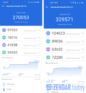 Сразу скажу, в реальном использовании я разницы между ними не замечаю. Оба шустро крутят интерфейс, быстро запускают программы, дают играть на максимальных настройках в играх и так далее. Но если сравнивать результаты в бенчмарках, то во всех тестах, в которых я их сравнил, впереди оказался realme 7 5G с новым Mediatek.