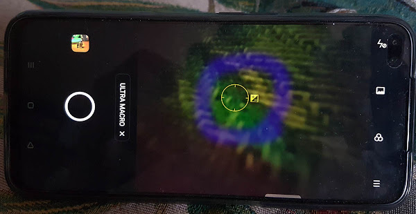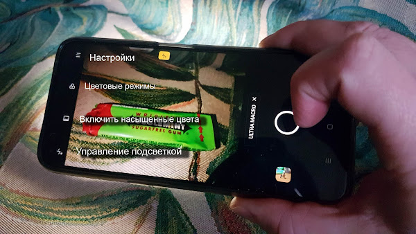 Режим макросъёмки выбирается свайпом влево из списка режимов камеры — Фото, Портрет, 64М, Ещё — UltraMacro. Фокусировка производится касанием пальца изображения (появится кружок +-, где можно сразу сделать светлее или темнее захват изображения).