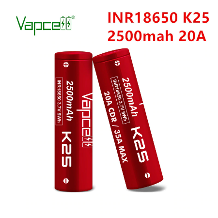 Еще одни высокотоковые аккумуляторы, которые я могу рекомендовать, это Vapcell K25 2.5Ач 20A. Аккумуляторы занимают среднее положение между высокотоковыми и универсальными так как заявлен ток до 35А. По факту аккумуляторы неплохо отдают ток до 25А а вот 35А отдают скорее только в пике и кратковременно. При этом ёмкость соответствует заявленной: около 2400-2500mah
