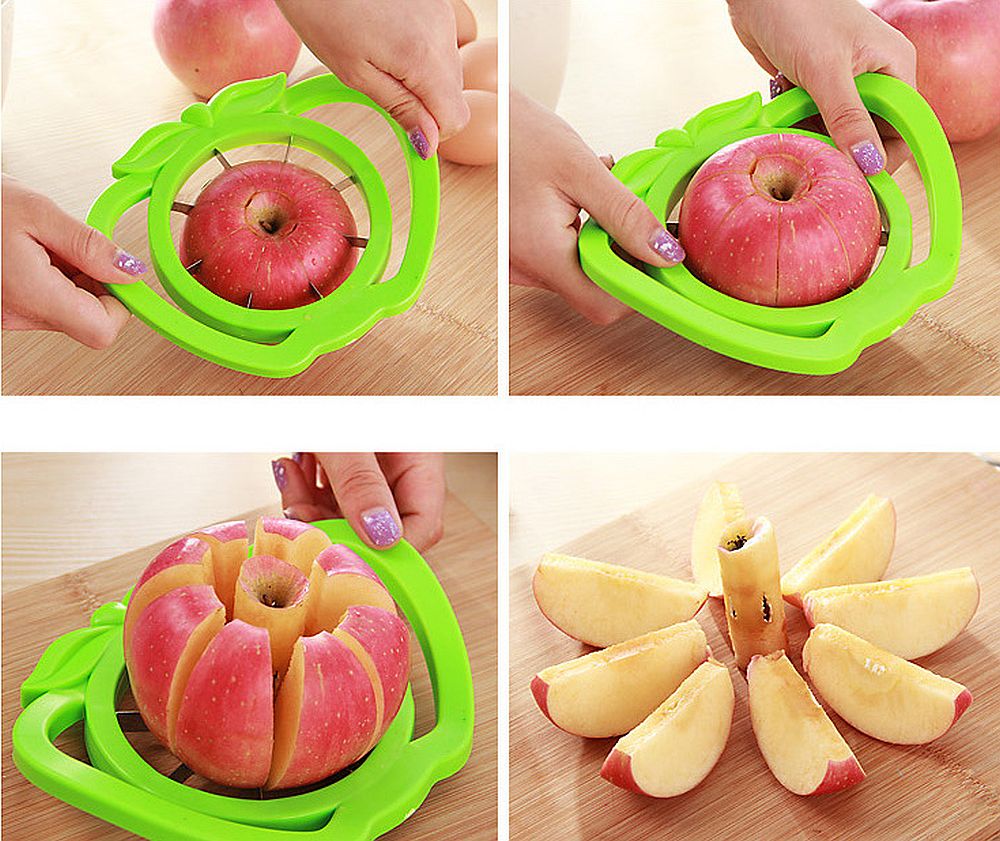 Забавная штука, которая позволяет максимально быстро разделить яблоко на восемь аккуратных долек, да еще и вырезать сердцевинку. Размер: 16*13,5см. Основная деталь приспособления — тонкие металлические пластины расположенные вокруг центрального кольца. Для разделки яблока достаточно установить овощерезку сверху него и просто надавить.