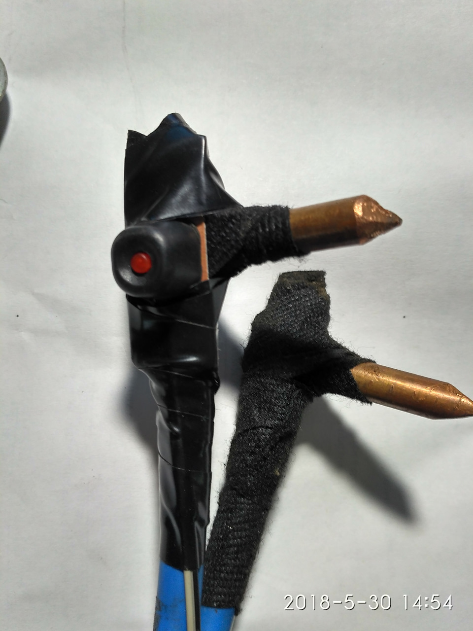 По случаю был на митинском, купил провод (синий толстый) клеммы для этого провода и жала (как оказалось с толщиной я переборщил) для паяльника. Изначально хотел сделать съемные электроды, но с токаркой пока не срослось в итоге просто припаял к клеммам и замотал лохматой изолентой.