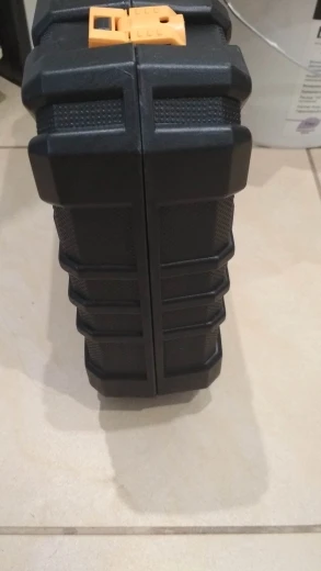 Соединение крышек кейсы сделано в виде шарнира (не пластиковая перемычка, -выглядет достаточно крепко). Брал в комплекте с головками и свёрлами. Свёрла по металлу показались слабыми, потому, что затупил одно сверло при сверлении оцинкованного листа железа, но допускаю, что мог задеть в этот момент кирпич.