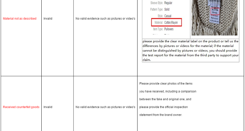 Received counterfeit goods Invalid No valid evidence such as pictures or video’s Please provide clear photos of the items