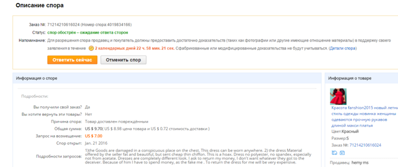 Помогите пожалуйста, я не совсем понимаю, что от меня требуется. Первый раз обострила спор на Алиэкспресс. Заказывала платье стоимостью- 9.70$, оно пришло ужасного качества (ткань платья совершенно другая, не такая как на фото продавца), еще и с затяжкой на груди. Открыла спор по причине повреждения товара, сначала просила полный возврат, продавец хотел вернуть всего 1.20$.