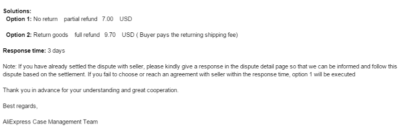 Note: If you have already settled the dispute with seller, please kindly give a response in the dispute detail page so that we can be informed and follow this dispute based on the settlement. If you fail to choose or reach an agreement with seller within the response time, option 1 will be executed