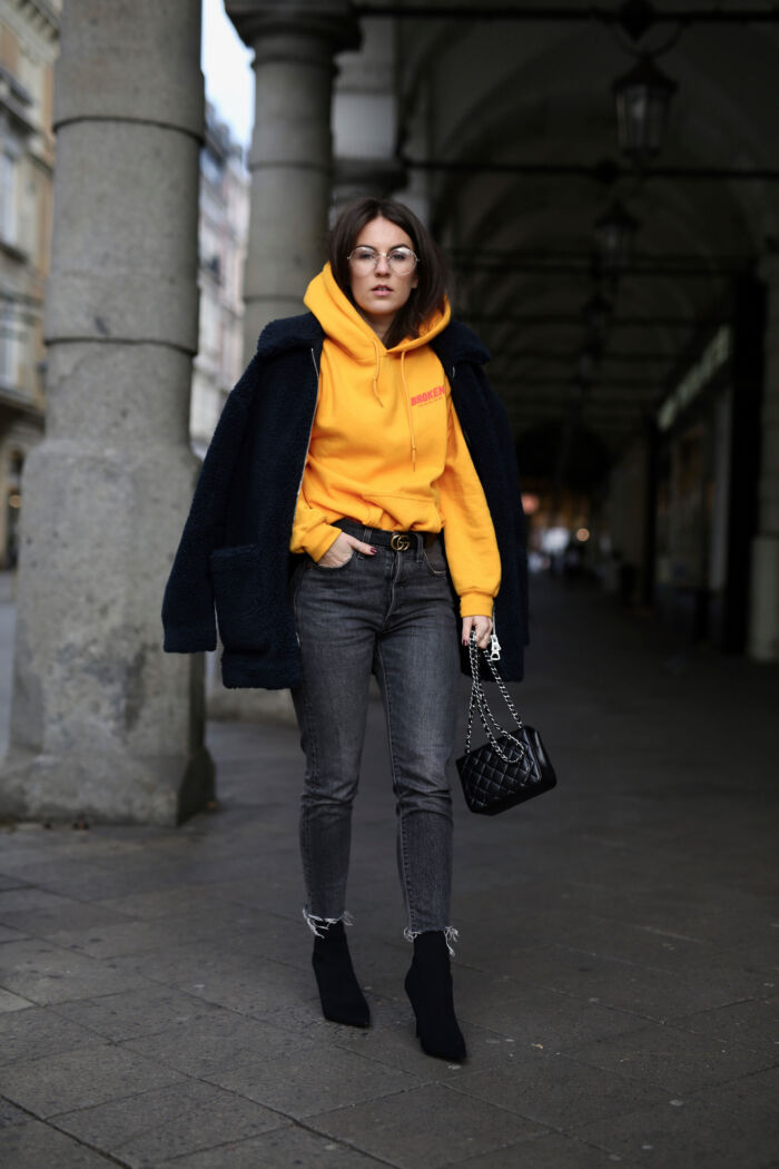 Толстовки с капюшоном не теряют актуальности из года в год. Их можно носить поверх маек, футболок и кроп-топов как в застегнутом, так и в расстегнутом виде. В тренде аутфиты в стиле нулевых — надевайте кофту с джинсовой мини-юбкой, укороченным топом и блестящим чокером. Такому образу позавидует сама Белла Хадид!