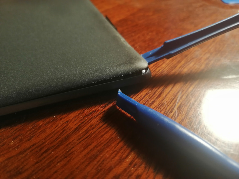 2.Лопаткой нужно поддеть заднюю крышку планшета и отщёлкнуть множественные защёлки по кругу. Поддеть лучше всего получилось в районе, где ставится сим-карта: