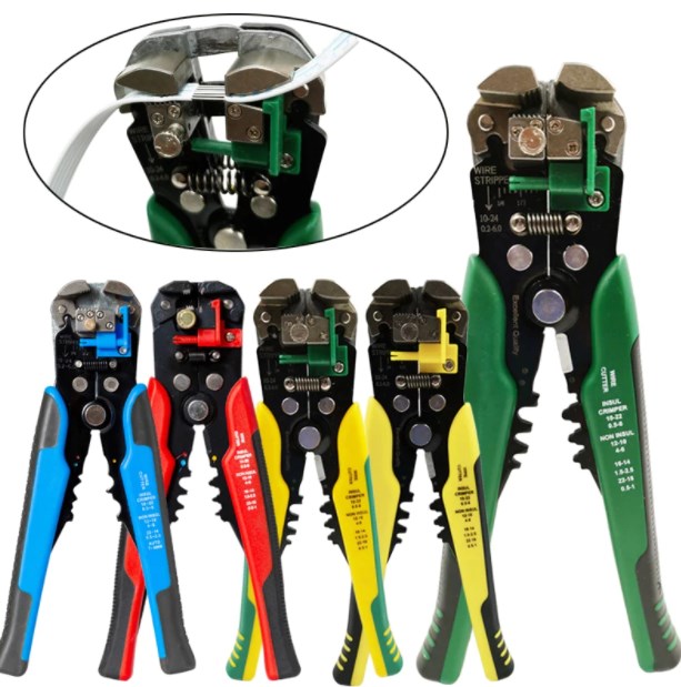 Это один из самых популярных инструментов для снятия изоляции на Aliexpress. Он работает на полуавтоматическом принципе. Устройство может снимать изоляцию с проводов диаметром от 0,2 до 6 миллиметров, также инструмент позволяет устанавливать клеммы на провода диаметром до 6 мм.
