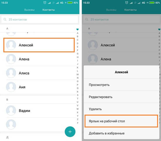 Осталось лишь выбрать действие на выбор – «Открыть контакт» или «Быстрый набор». При первом варианте, при нажатии на иконку на рабочем столе, быстро откроется карточка нужного человека. Если использовать второй вариант, то мгновенно начнется набор номера.