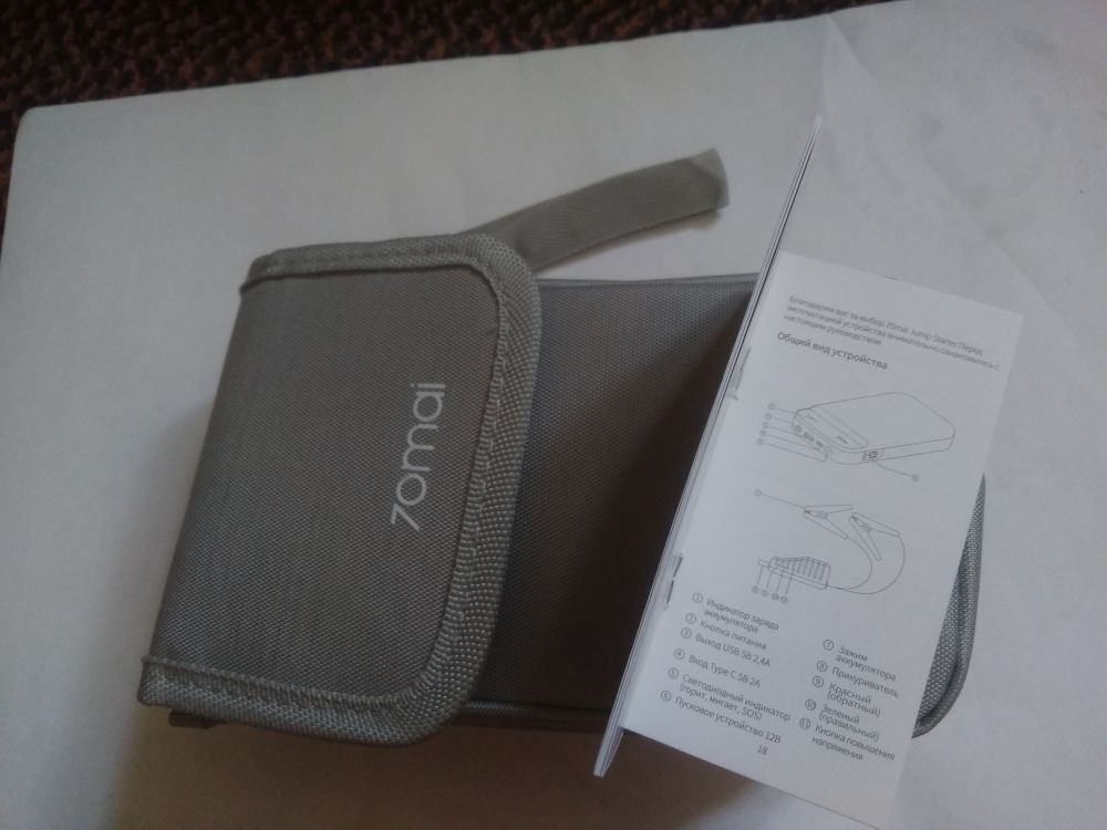 Данный гаджет пришел ко мне по почте в упаковке, в которой находилась симпатичная твердая коробочка черного цвета. В самой коробочке находилась чехол (сумочка) с самим гаджетом и дополнительные комплектующие к нему: пусковое устройство с зажима (крокодилами), короткий кабель USB type С для зарядки аккумуляторной батареи и, конечно же, инструкция, которая напечатана на английском и русском языках.