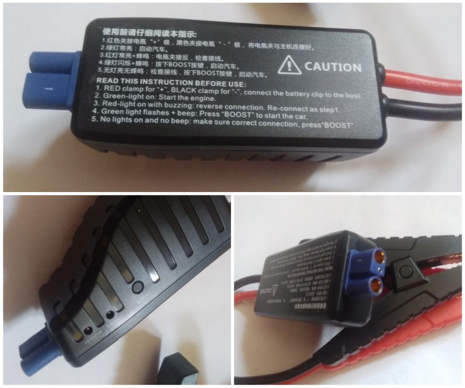 На боковой стороне – два светодиода и кнопка “boost”, с одного торца разъем для подключения к повербанку синего цвета с защитой “от дурака”, на другом – два провода красного и черного цветов, заканчивающиеся зажимами на клеммы аккумулятора.