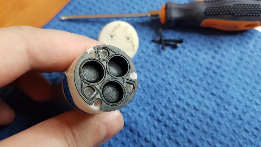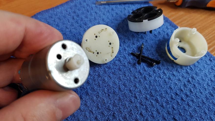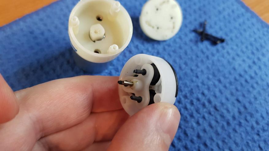 В пластиковой части, поломок я не обнаружил, потому расковырял сам двигатель. И поломка вылезла сразу. Слабым звеном сего китайского чуда являются щетки двигателя. Они сделаны походу из фольги и просто перетерлись.