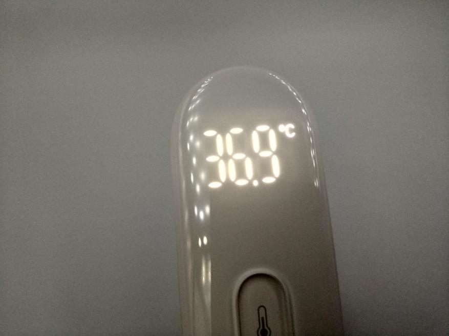 Экран отображает температуру с точностью до десятых градуса. Экран находится сверху, когда выключен, цифры не видны. Замер после физической активности показал 36.9 градусов.