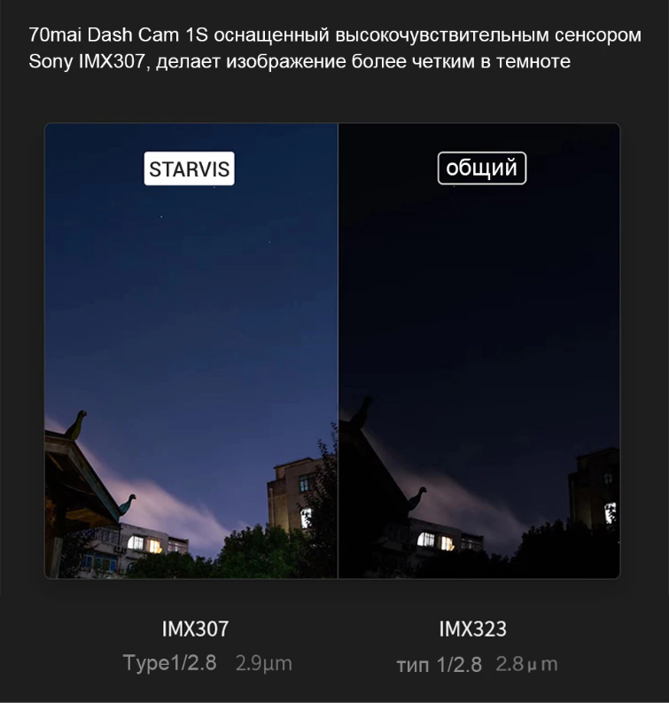 Сенсор IMX307 является одним из представителей серии датчиков Sony Starvis с улучшенной работой в темноте. Поздним вечером в городе, на шоссе, за городом или в иных условиях с плохим освещением, он стабильно выдает четкую и качественную картинку.