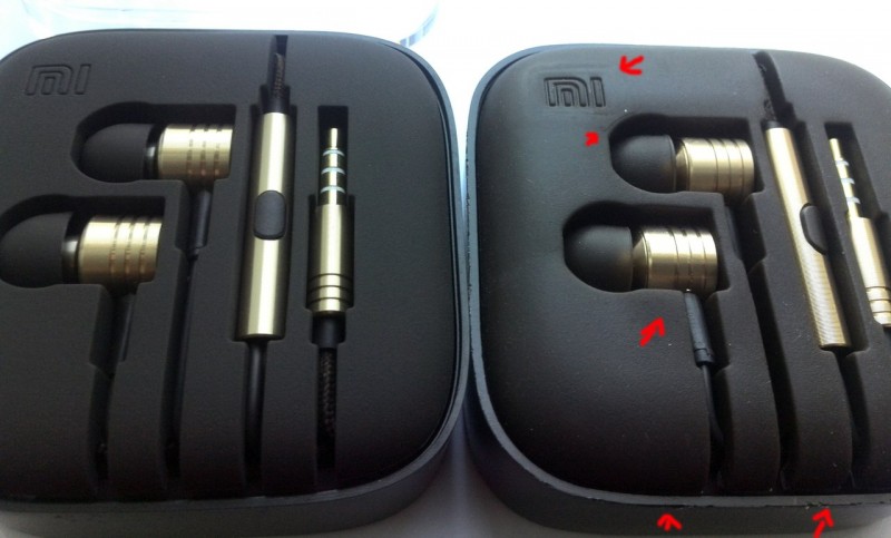 Самые большие отличия это — отверстие в амбушюрах (слева — больше), отсутствие отметки L и R и достаточно небрежное выполнение манжеты провода.