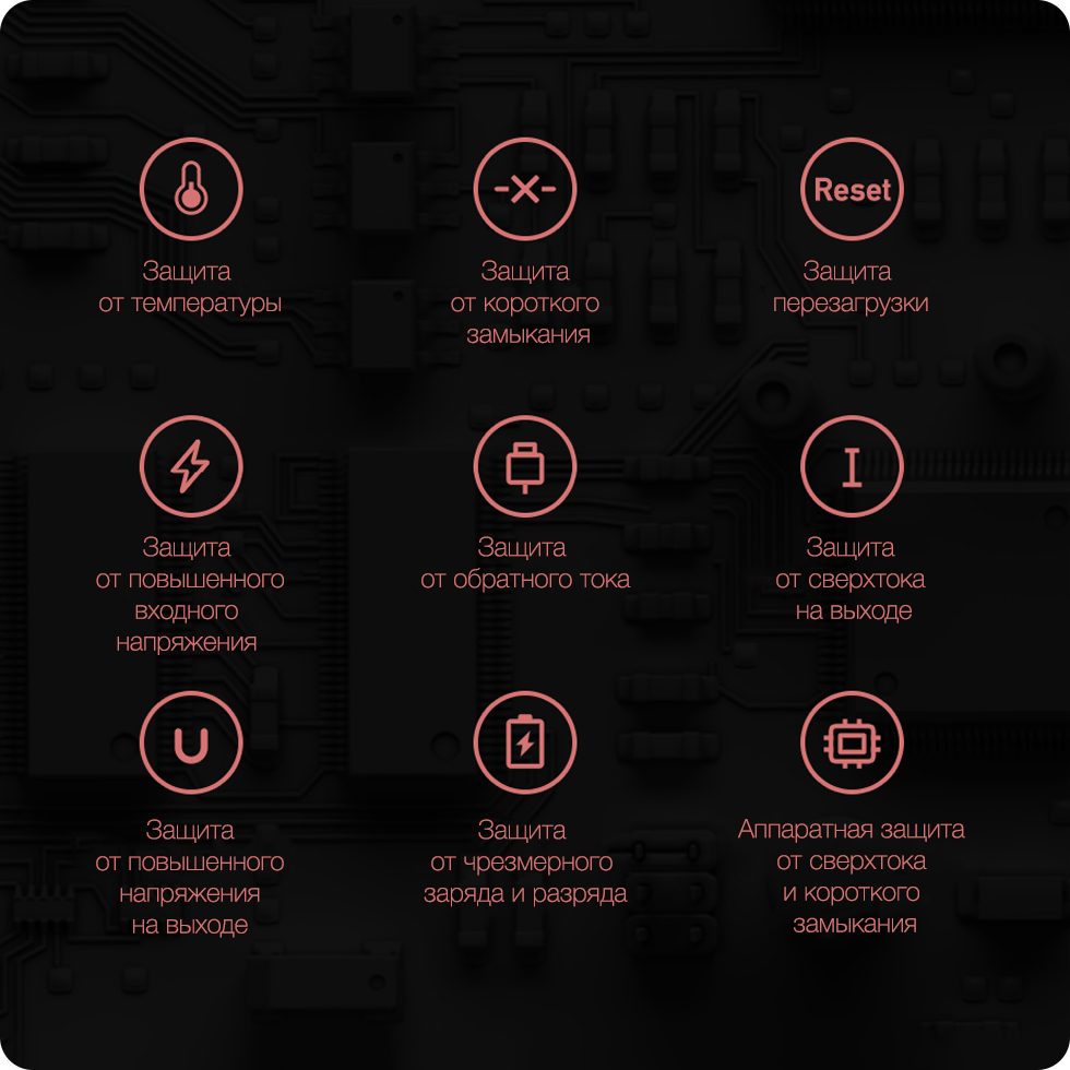 Высокочувствительные ёмкостные датчики и передовая плата управления питанием без риска для аккумулятора и заряжаемых устройств справятся с чрезмерным зарядом или разрядом, коротким замыканием, перегревом и другими проблемами, не подвергая устройства и малейшей опасности.