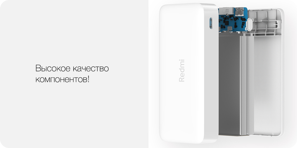 Внешний аккумулятор Redmi ёмкостью 20’000 мАч благодаря умному USB-контроллеру зарядки совместим с абсолютным большинством смартфонов на рынке. Его ёмкости хватит, чтобы 5 раз зарядить Xiaomi Mi 9, и даже после этого он не останется без заряда. С ним можно вообще забыть о ёмкости аккумулятора смартфона.