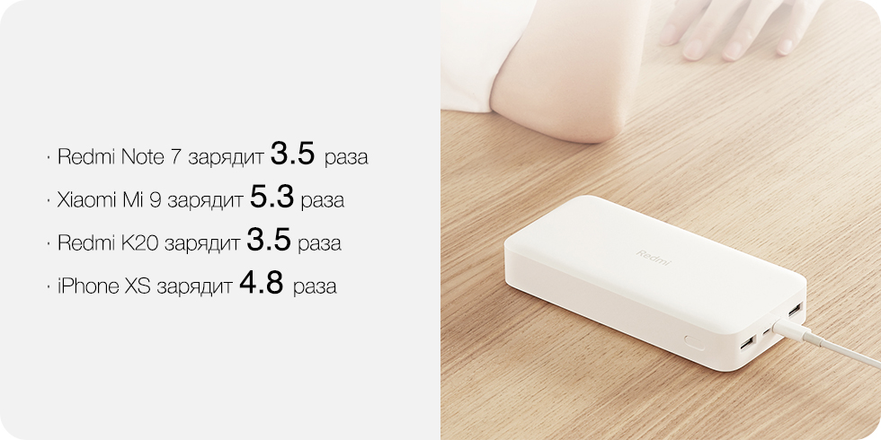 Заряда павербанка Redmi на 20 000 мАч достаточно, чтобы полностью зарядить Redmi Note 7 — 3,5 раза, Mi 9 — 5,3 раза, Redmi K20 — 3,5 раза и iPhone XS — 4,8 раза.