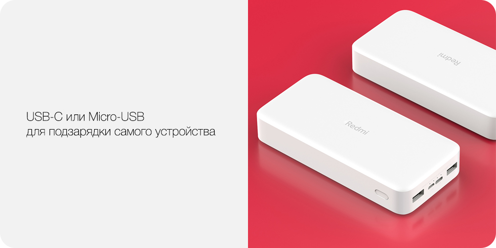 Каждый из двух портов USB-A внешнего аккумулятора Redmi ёмкостью 20’000 мАч может выдавать мощность до 18 Вт, при одновременной работе обеих портов их суммарная мощность может составлять 5.1В 3.6А, чего хватит сразу и для смартфона, и для планшета.
