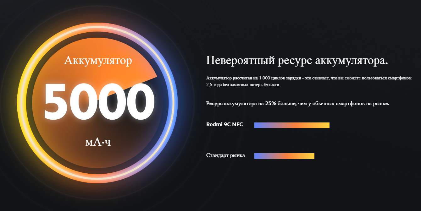 27 дней работы в режиме ожидания! Много, но какие цифры при использовании? 167 часов при прослушивании любимой музыки, 32 часа при разговорах по телефону о важных для вас вещах, 10 часов гейминга без подзарядки и 21 час просмотра нового сезона сериала. Такие хорошие показатели Redmi 9C дополняются продлением срока службы батареи до 1000 циклов заряда, что позволит использовать смартфон ежедневно в течение более 2,5 лет без какого-либо заметного ухудшения состояния батареи. Также увеличилась долговечность батареи смартфона, а точнее на 25% по сравнению с рыночным стандартом.