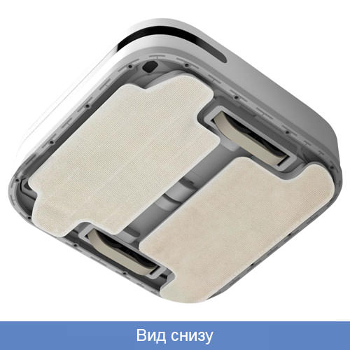 На днище полотёра располагаются рабочие инструменты – две съёмные платформы с креплениями для моющих тряпок из микрофибры. По краям днища – резиновые гусеницы на двух роликах с независимой подвеской, в передних углах – датчики падения.